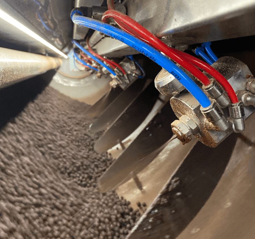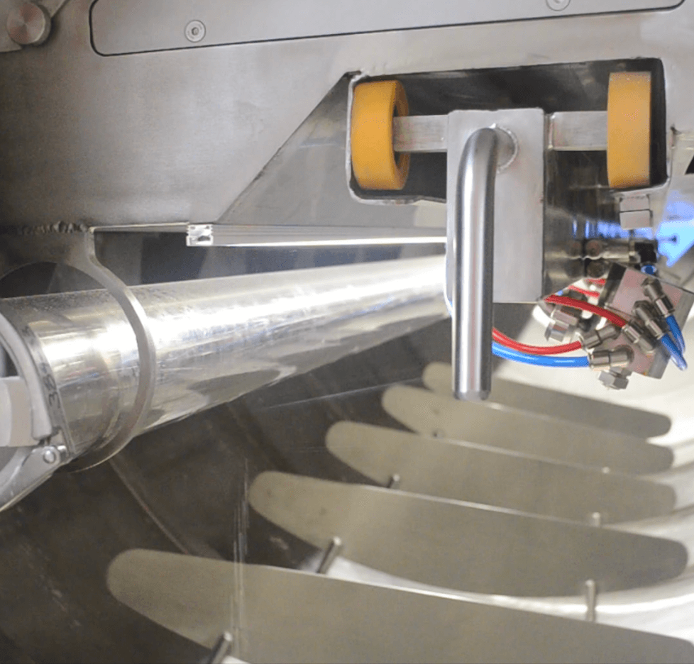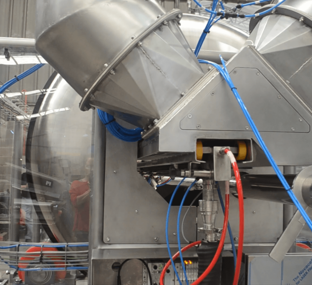 En este equipo, el aire de proceso se inyecta y se extrae desde dentro del tambor, mediante un ducto de aire instalado al centro del tambor y debe ser un aire deshumidificado, a una temperatura baja, especial para solidificar el chocolate.